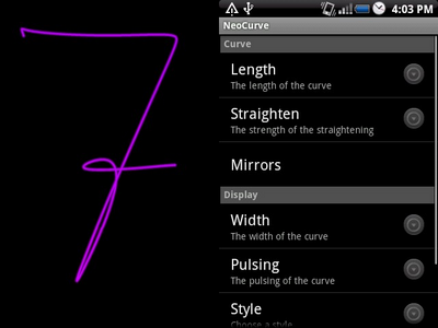 NeoCurve is a neon-style drawing app on a black background. You can draw colored lines that follow you finger.